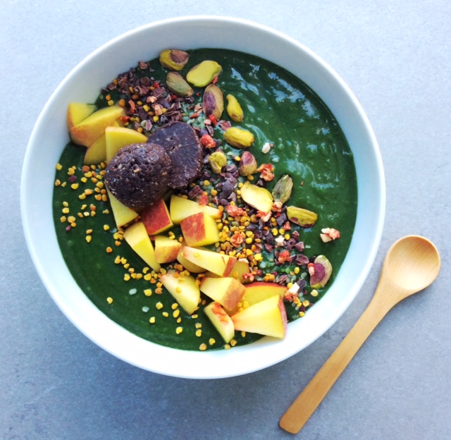 Toppings (optional and to taste): hemp hearts, pistachio nuts, 1/2 peach roughly chopped, cacao nibs, bee pollen, freeze dried strawberries, Homemade Chocolate Truffle Bliss Ball