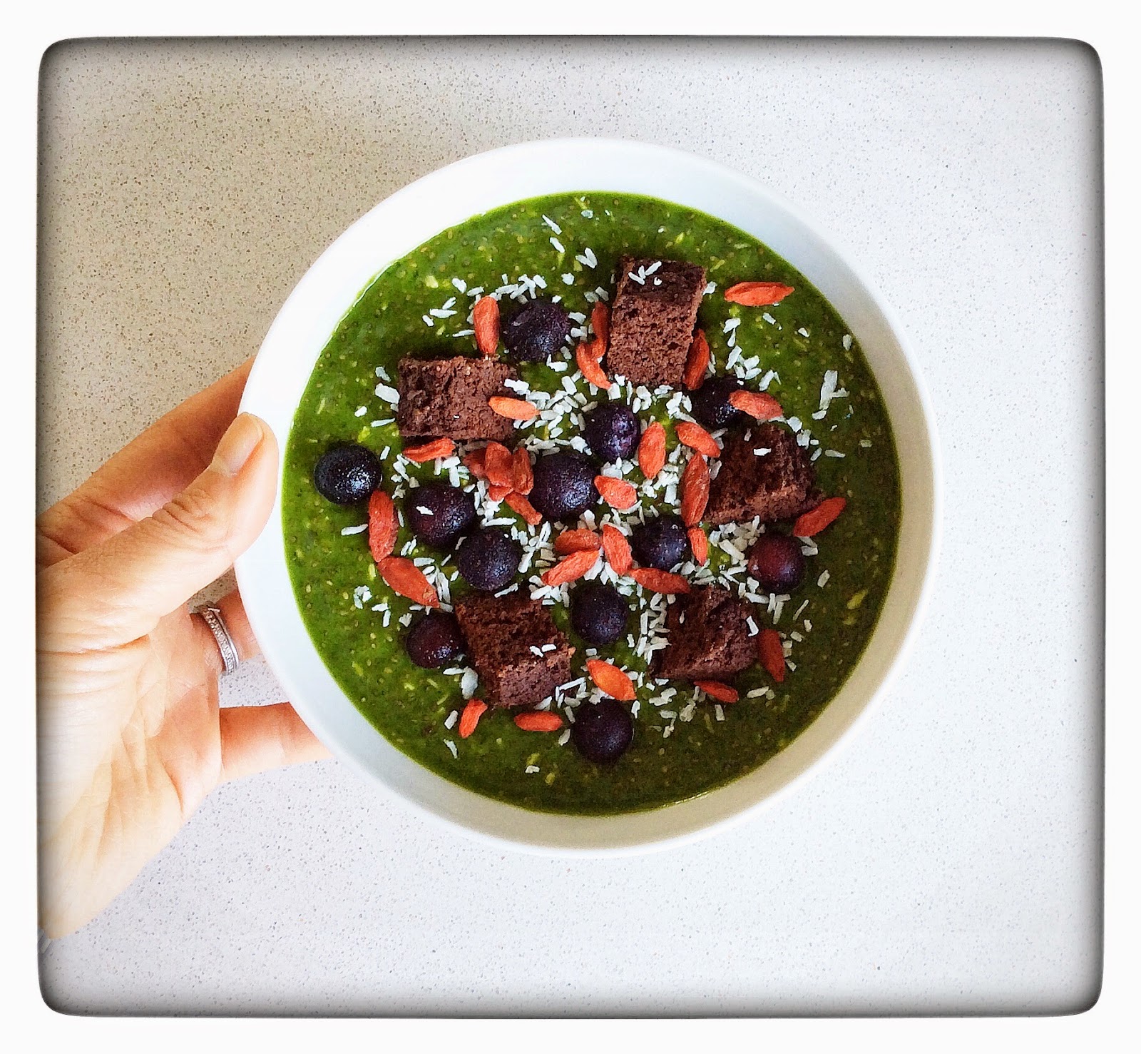 Feel free to play around with toppings once the base is made. I like it best with a handful of fresh berries, a few chunks of my Sweet Potato Cocoa Brownies (For recipe Sweet Potato Cocoa Brownies), a sprinkle of extra coconut and some bright orange goji berries peeking through.