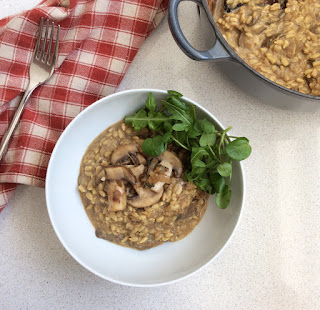 Both the recipes I had seen were for basic vegetable risottos so I wanted to adapt them to create one of my fondest risotto memories - a creamy, cheesy mushroom risotto. In fact, this was one of the first dishes my husband and I made together and our 'Risotto cookbook' (which now lies dormant and dusty) was a trusted friend in our early years together, whether just cooking for the two of us or for entertaining friends.