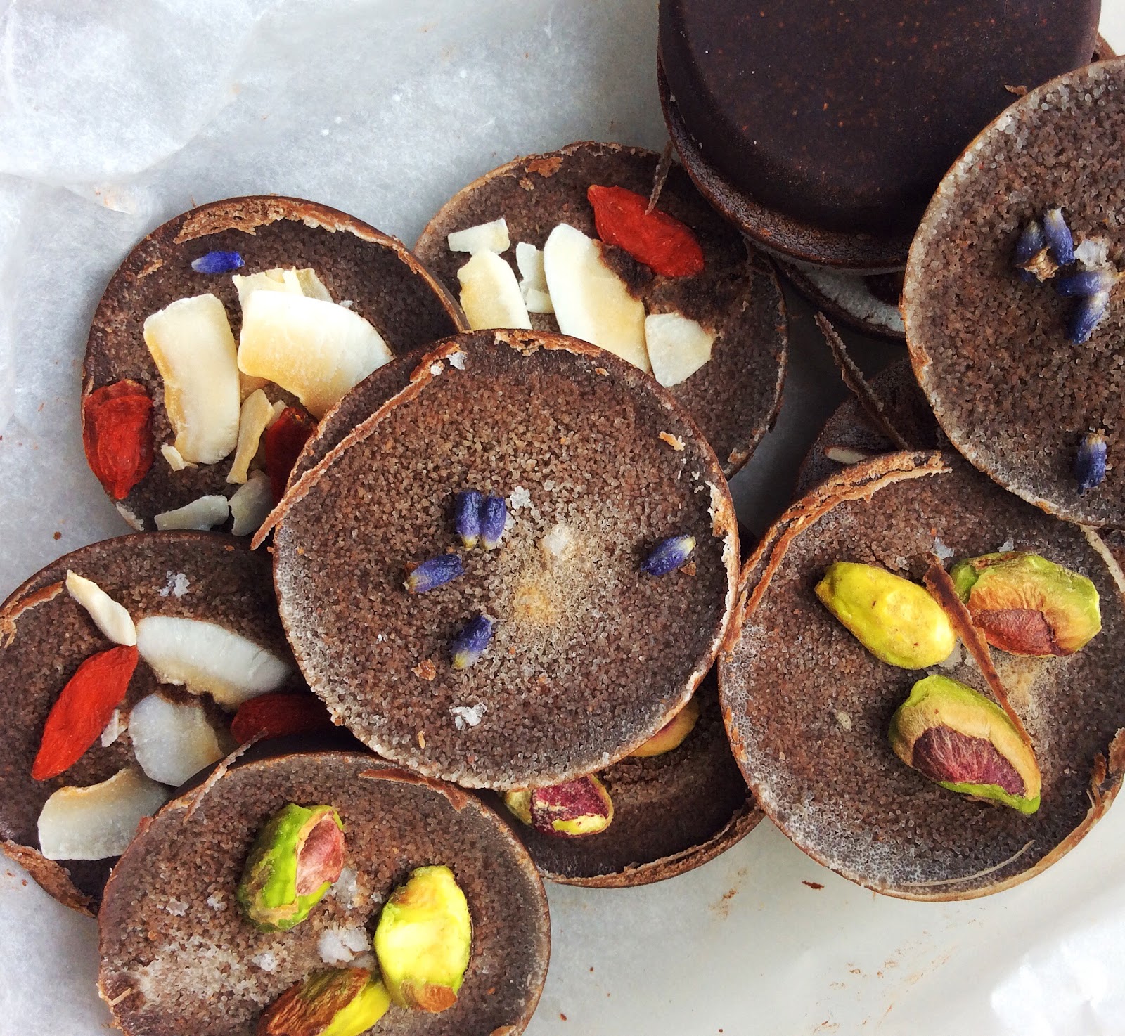 optional extras for decorating: nuts and/ or dried fruit of choice - I used lavender petals + sea salt, goji berries + coconut, pistachios + cacao nibs