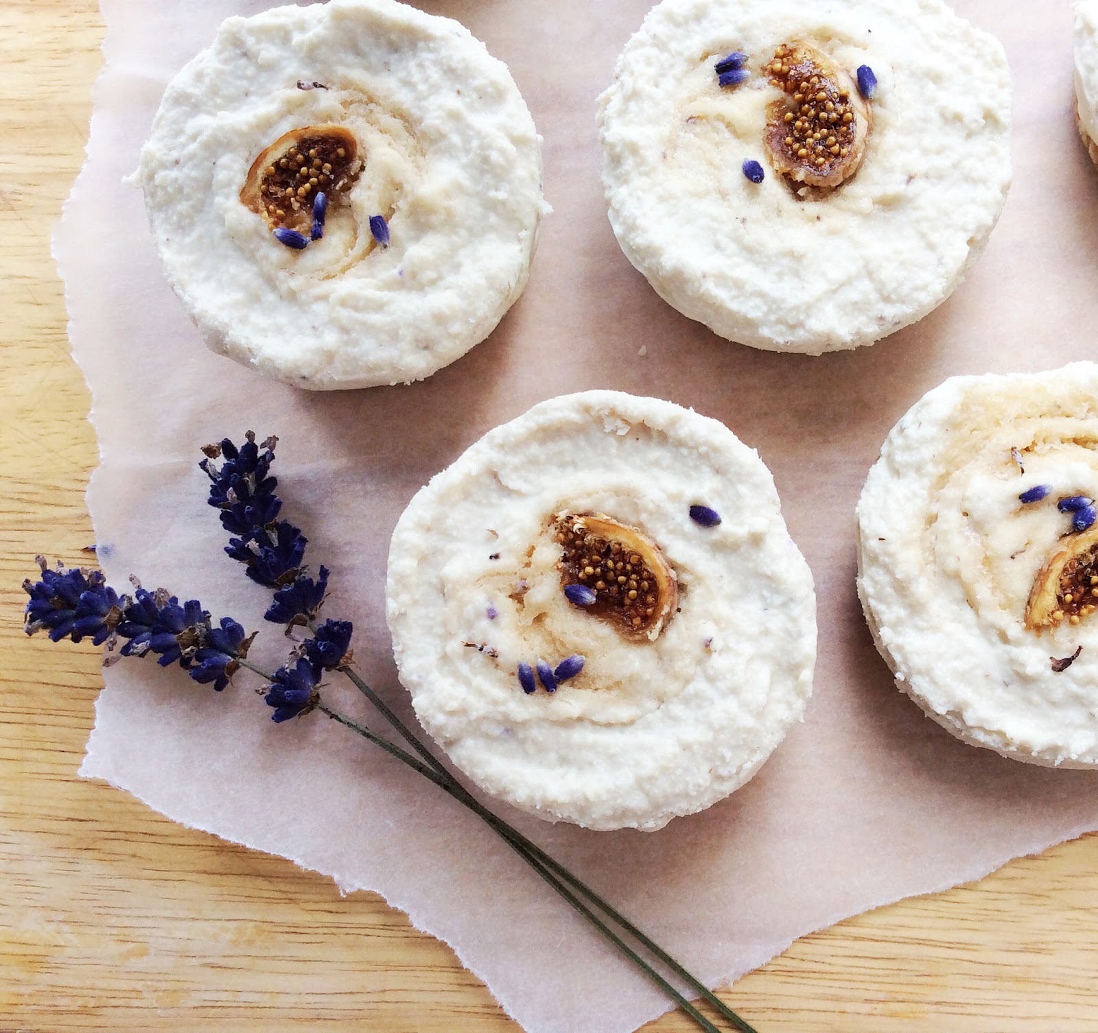8. Retrieve muffin tray from freezer and spoon creamy top mixture over the bases. Smooth surfaces gently before decorating with a small drizzle of honey, a few lavender flowers and slice of dried fig if using.