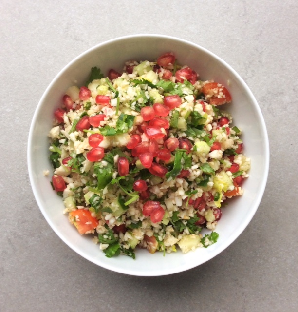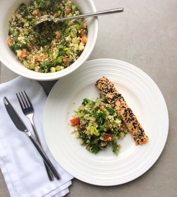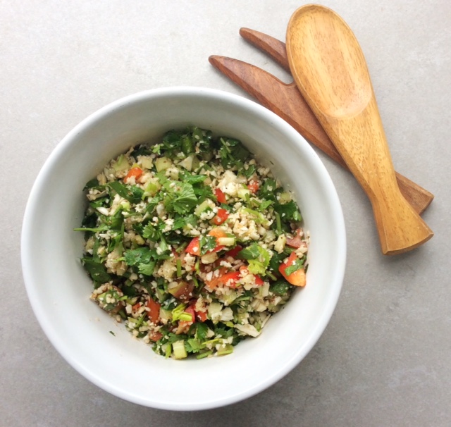 I use riced celeriac in place of the traditionally used bulgar wheat for a gluten and grain free version. I find it lends the right texture, being slightly firmer than say cauliflower, while still looking vaguely similar and without the cruciferous undertone of cauliflower which this recipe doesn't call for.