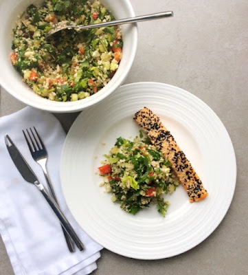 Traditional tabouleh uses parsley and lots of it but my preferred leafy herb is coriander - do feel free to experiment and go down the traditional route. Likewise, feel free to add finely chopped spring onions and/ or a quarter bell pepper but these are optional.