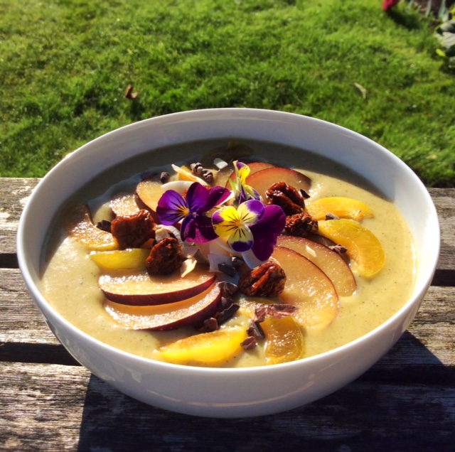 Toppings: any nuts, seeds, fruits of choice - I have used plum, greengage, coconut flakes, golden berries (physalis), edible flowers and bee pollen