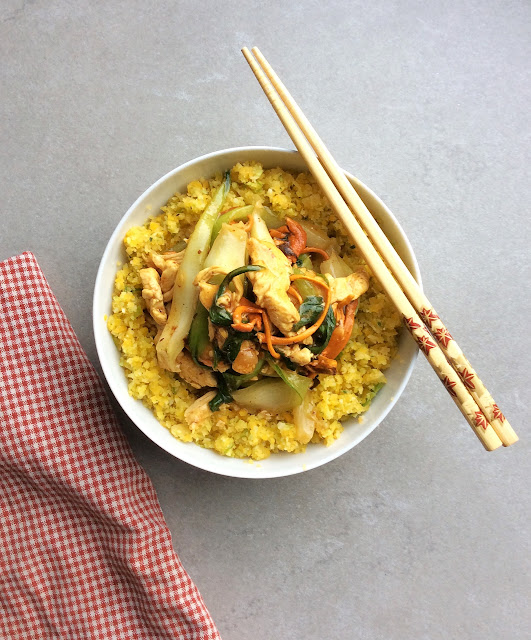 This dish is super quick to whip together and is very much cooked in the style of my mother - in the traditional Chinese way of prepping all the meat and veg first before hitting the pan for a a rapid fire stirfry, followed by a slurry (using arrowroot starch and water) to thicken the sauce. Serve on top of a pile of riced cauliflower (or any other veg that suits - i used a combination of swede, squash, broccol and leek seasoned with a pinch of turmeric) or a traditional and simple bowl of white rice.