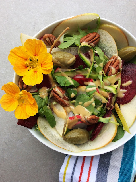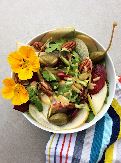Autumn is here. Pears are abundant. Despite the colder weather I am clinging persistently to my lunchtime salads before they hibernate to make way for winter warmers. This autumnal bowl combines the sweetness of pears with earthy beetroot and crunchy pecans. The caperberries provide a little sharp and salty zing which is balanced out by the mellow creamy tahini dressing. And plenty of immune boosting nutrients and vitamin C in watercress to ward off those pesky colds.