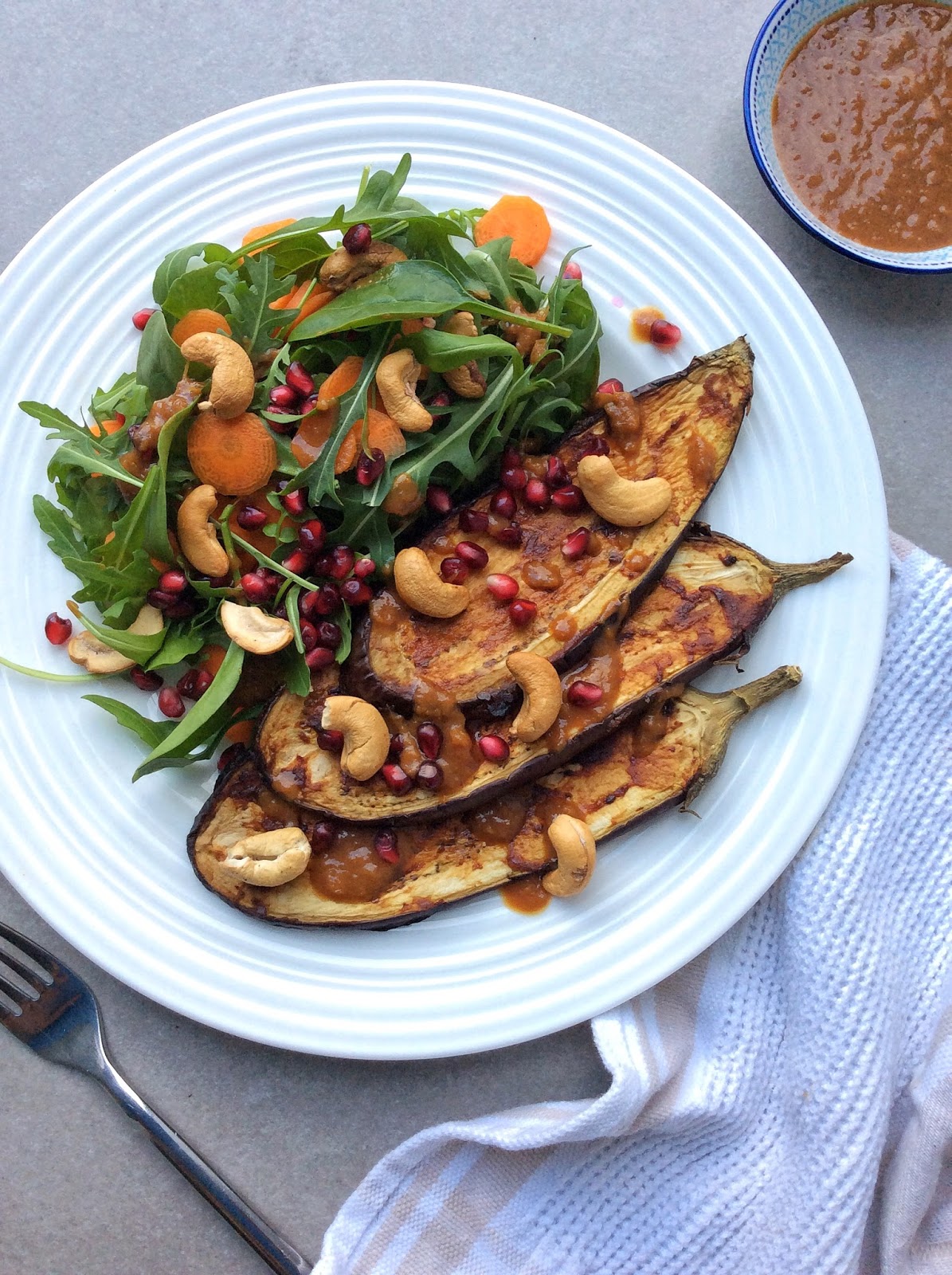 6. Arrange aubergine slices on serving plates alongside rocket leaves and carrot. Scatter over pomegranate and cashew nuts before drizzling over dressing. Serve extra dressing on the side if needed.