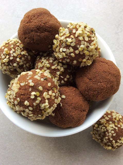 5. Roll into approx tablespoon sized balls (or as preferred) and roll in hemp seeds if desired. Refrigerate for an hour or so to firm up slightly. Or pop in freezer for 30mins. Store in fridge in sealed container or freeze and defrost for a few minutes at room temperature before eating.