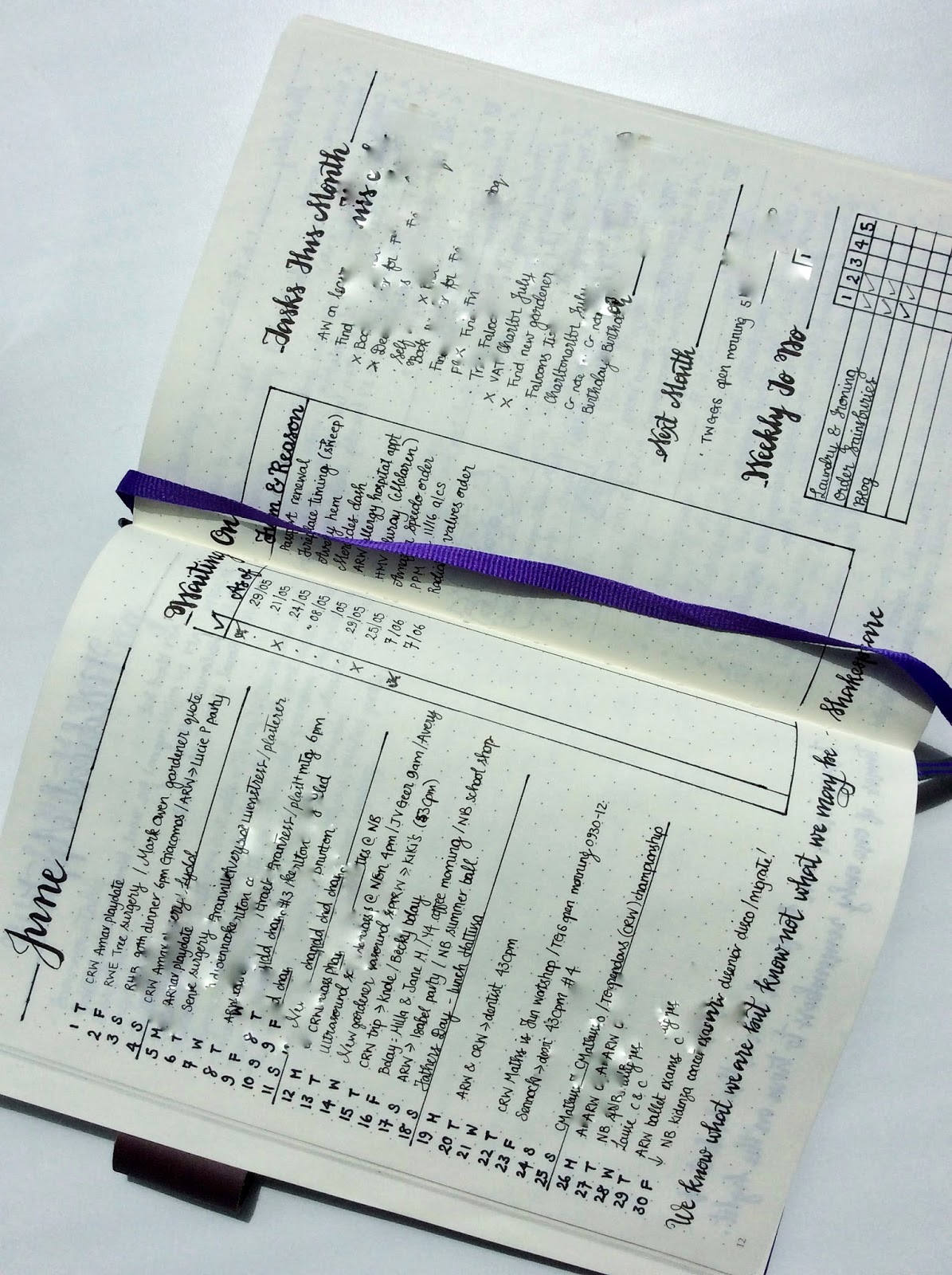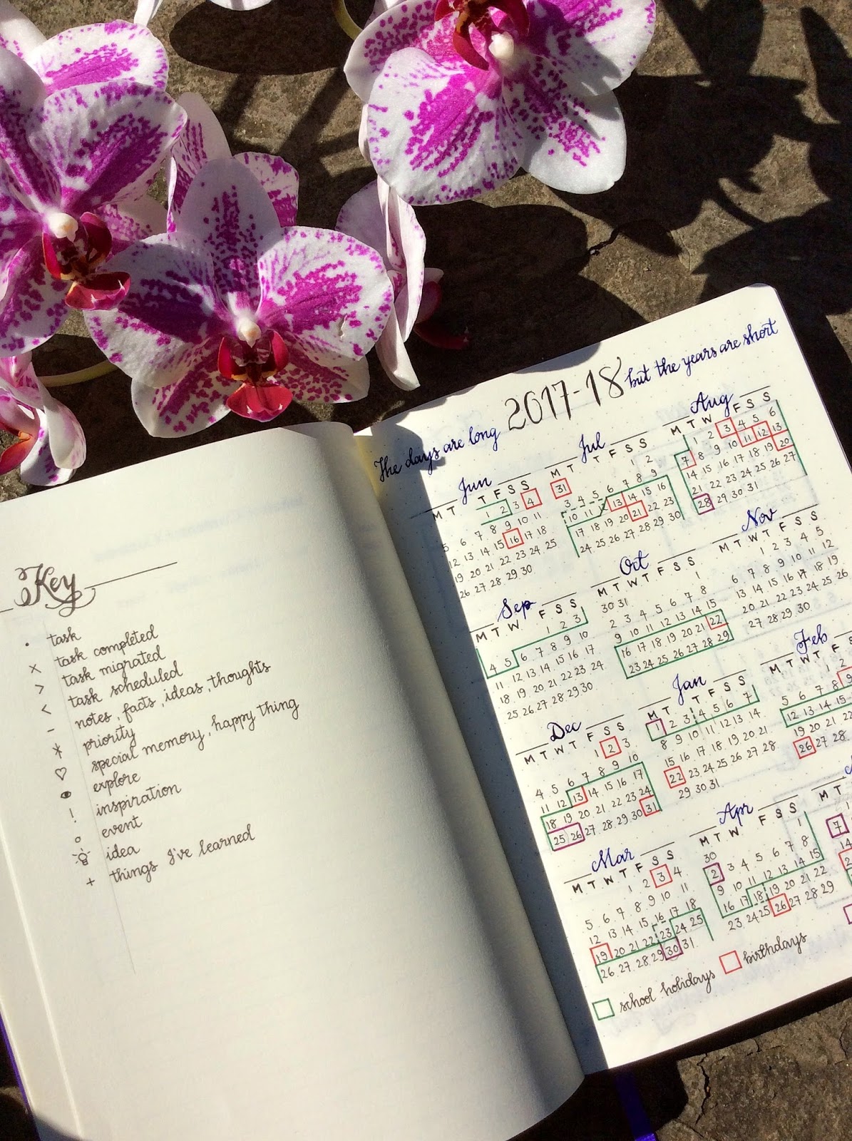 A few posts back I reviewed my experiences with Bullet Journalling and how it has changed my life, organisationally speaking. You can read it here. On embarking on my second journal I approached it with less no-frills function as I had when just starting out, and with a little more flair and personality, now that I know what does and doesn't work for me personally. Check out my lovely Year At a Glance page which includes all the school holidays, birthday and bank holidays neatly colour coded for ease of organisation, ahem, 'at a glance'.