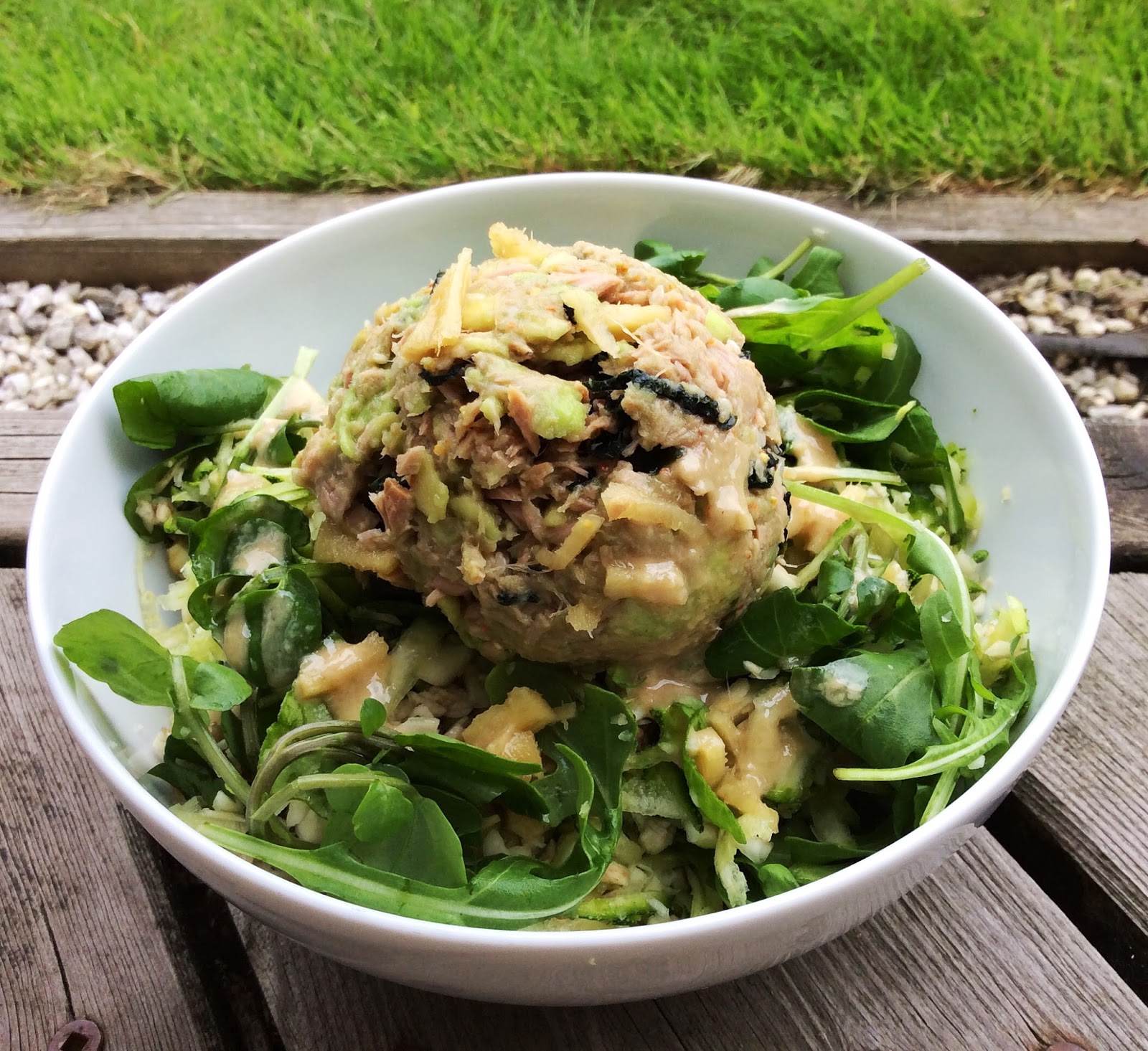 5. Spoon or scoop the tuna/ avo mix and pile on top of the dressed salad base.