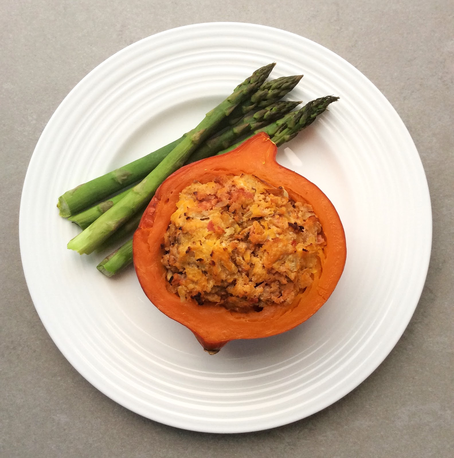 | One Pan Meatloaf Stuffed Roast Squash with Asparagus |