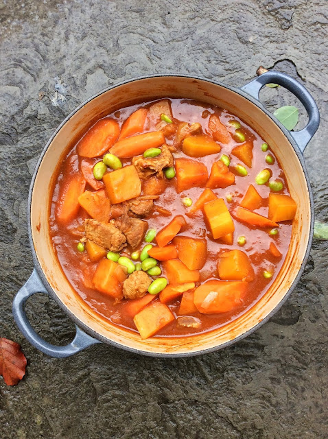 This simple pot of warming curry can be adapted to use whatever meat you have to hand - I used lean pork leg here but it works just as well with chicken breast/ thighs, beef or even just vegetables for a meat-free dish. Likewise, though I have used carrots, squash and sweet potato, an array of other veg could be used instead (just adjust cooking times accordingly). Serve with plenty of white rice or cauliflower rice to soak up the sauce.
